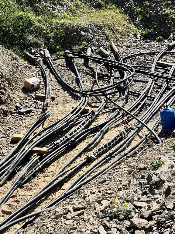 hier ist die Bohrstelle auf der Muxerather Seite, die Kabel sind schon zur Görgenhofer Seite eingezogen, einige sind schon miteinander verbunden.